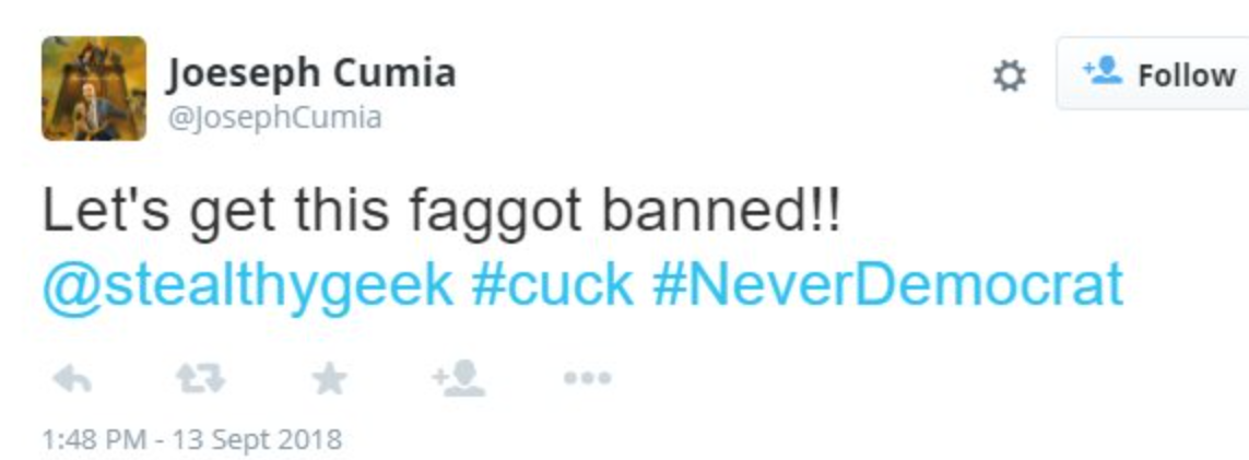 This tweet is a fake, turns out it never existed. It was photoshopped and sent to me and several others by the same trolls who got my account suspended in the hopes I would falsely attribute it to Mr. Cumia and go on the attack against him. And while a quick perusal of Mr. Cumia’s public statements and behavior prove he and I are already natural enemies, he is innocent of this. It was just another component of the troll’s targeted harassment campaign. A campaign they celebrated publicly only moments after their false attack succeeded in suspending my twitter account.