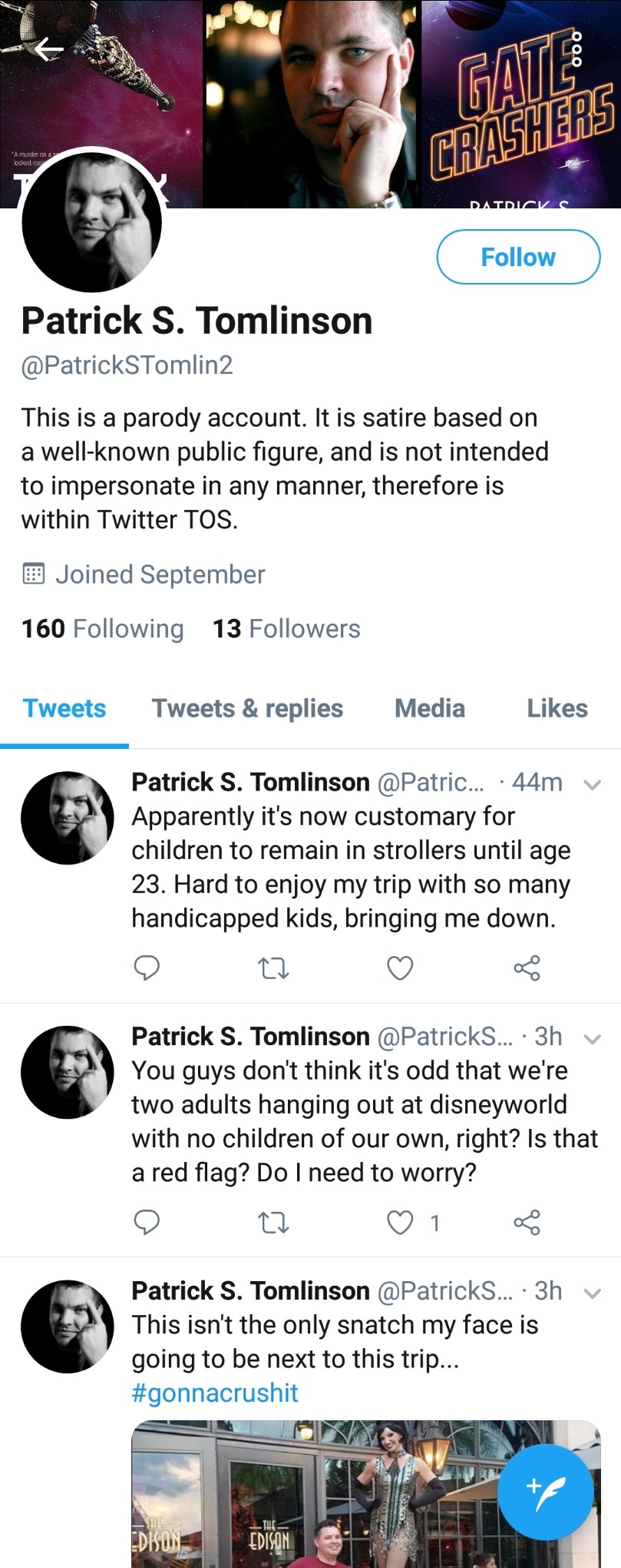 Hello, my name is Patrick S. Tomlinson (formerly @stealthygeek and @patricktomlin1, both of which are now suspended). Some of you know me as a science-fiction author. More of you probably know me as that one guy who wrote the abortion thought experiment that went viral last October