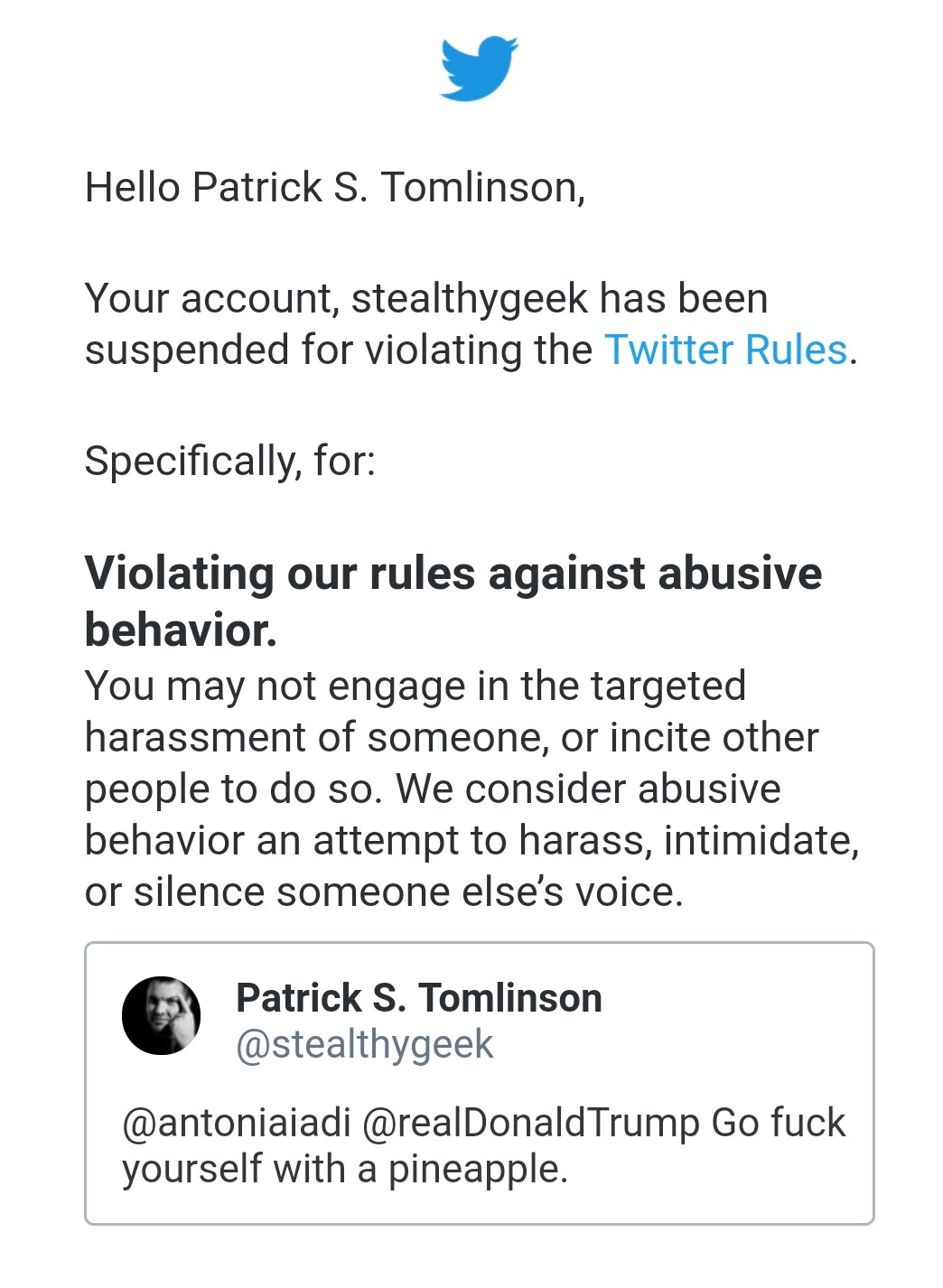 Recently, exactly this situation happened to me. On Friday the 14th, I was informed my verified twitter account with more than thirty-eight thousand followers had been suspended, permanently, for “targeted harassment,” consisting of a single tweet directed at a pro-Trump troll account spreading victim-blaming and propaganda in the wake of Trump’s conspiracy theory regarding the three-thousand Americans who died in Puerto Rico following Hurricane Maria.