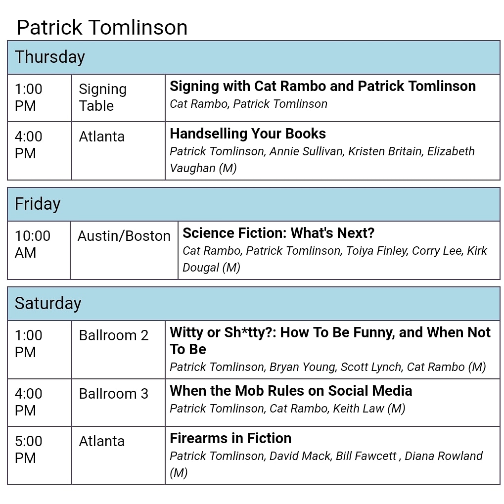 Anyway, here’s my signing and panel schedule. Swing by and say hello!