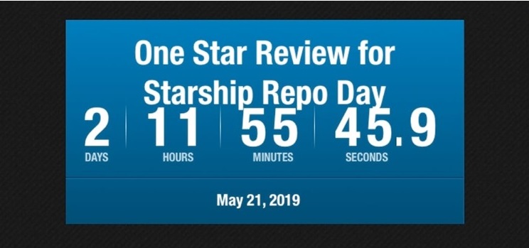 Now, if you can find any anti-Semitic dog whistles or references to women leaving their husbands for African Americans anywhere in there, you should probably lay off the drugs for a while. Not only is this review fake, it is deliberately abusive and libelous. But they’re not content with past abuses, oh no. For months now, this sub has been counting down the days until they can review carpet bomb STARSHIP REPO with more of the same fake ratings the second it’s released, hoping to tank sales. That’s not hyperbole, by the way. They literally have a countdown clock: