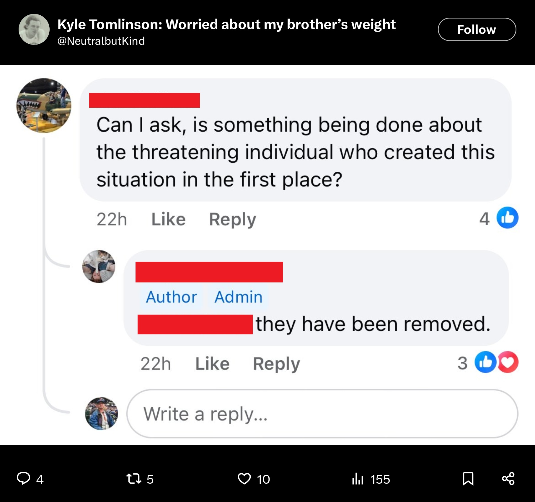 This is a screengrab from PenguiCon’s official Facebook group page, taken by one of the criminals stalking my family and posted on one of their many Twitter sockpuppets (this one impersonates my little brother’s name and likeness without his consent).